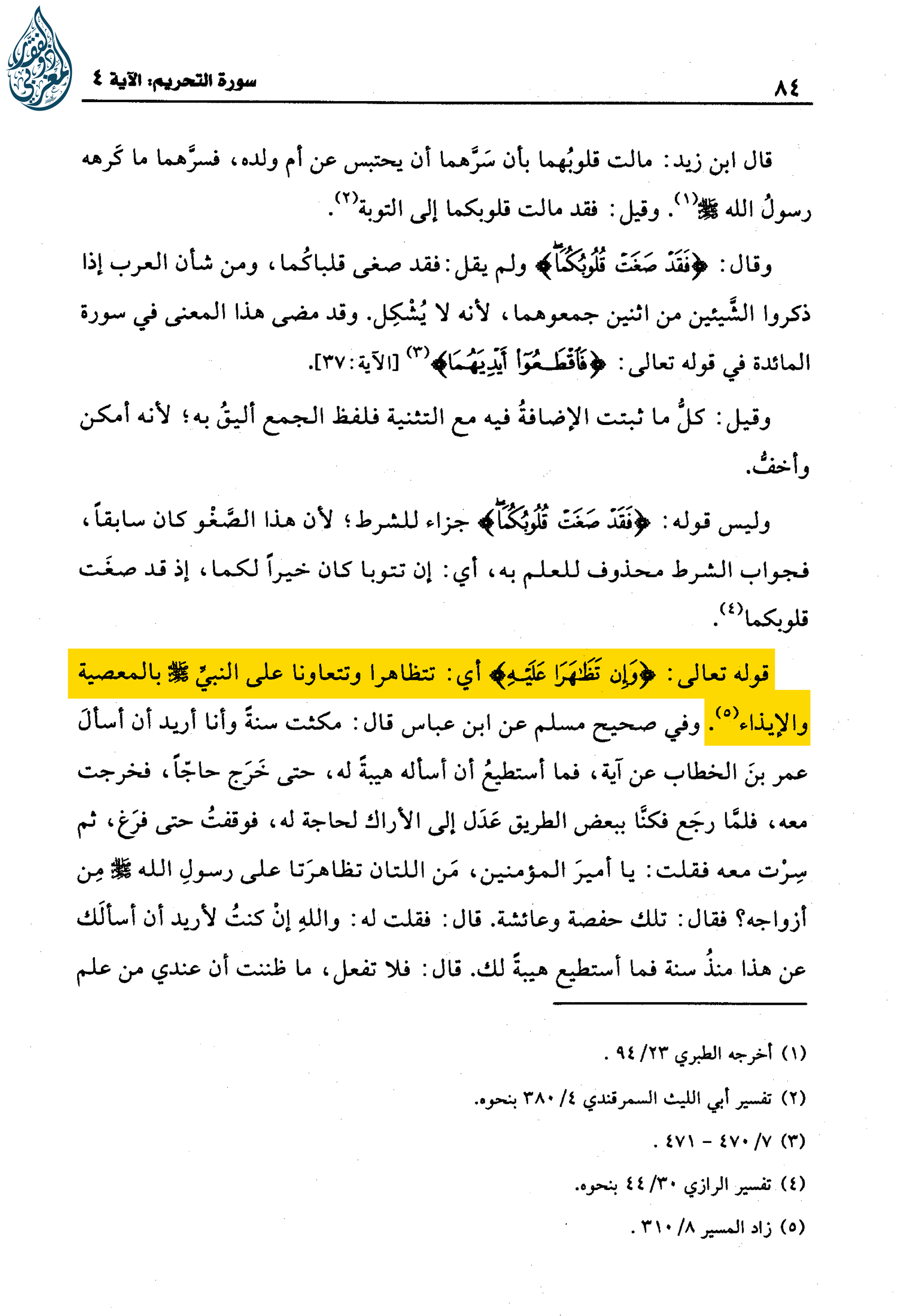 قَوْلُهُ تَعَالَى: (وَإِنْ تَظاهَرا عَلَيْهِ) أَيْ ‌تَتَظَاهَرَا ‌وَتَتَعَاوَنَا ‌عَلَى ‌النَّبِيِّ صلى الله عليه وسلم بِالْمَعْصِيَةِ وَالْإِيذَاءِ. وَفِي صَحِيحِ مُسْلِمٍ عَنِ ابْنِ عَبَّاسٍ قَالَ: مَكَثْتُ سَنَةً وَأَنَا أُرِيدُ أَنْ أَسْأَلَ عُمَرَ بْنَ الْخَطَّابِ عَنْ آيَةٍ فَمَا أَسْتَطِيعُ أَنْ أَسْأَلَهُ هَيْبَةً لَهُ، حَتَّى خَرَجَ حَاجًّا فَخَرَجْتُ مَعَهُ، فَلَمَّا رَجَعَ فَكُنَّا بِبَعْضِ الطَّرِيقِ عَدَلَ إِلَى الْأَرَاكِ «1» لِحَاجَةٍ لَهُ، فَوَقَفْتُ حَتَّى فَرَغَ، ثُمَّ سِرْتُ مَعَهُ فَقُلْتُ: يَا أَمِيرَ الْمُؤْمِنِينَ، مَنِ اللَّتَانِ تَظَاهَرَتَا عَلَى رَسُولِ اللَّهِ صلى الله عليه وسلم من أَزْوَاجِهِ؟ فَقَالَ: تِلْكَ حَفْصَةُ وَعَائِشَةُ. قَالَ فَقُلْتُ له: والله إن كنت لأريد أن سألك عَنْ هَذَا مُنْذُ سَنَةٍ فَمَا أَسْتَطِيعُ هَيْبَةً لَكَ. قَالَ: فَلَا تَفْعَلْ، مَا ظَنَنْتَ أَنَّ عِنْدِي مِنْ عِلْمٍ فَسَلْنِي عَنْهُ، فَإِنْ كُنْتُ أَعْلَمُهُ أَخْبَرْتُكَ … وَذَكَرَ الْحَدِيثَ