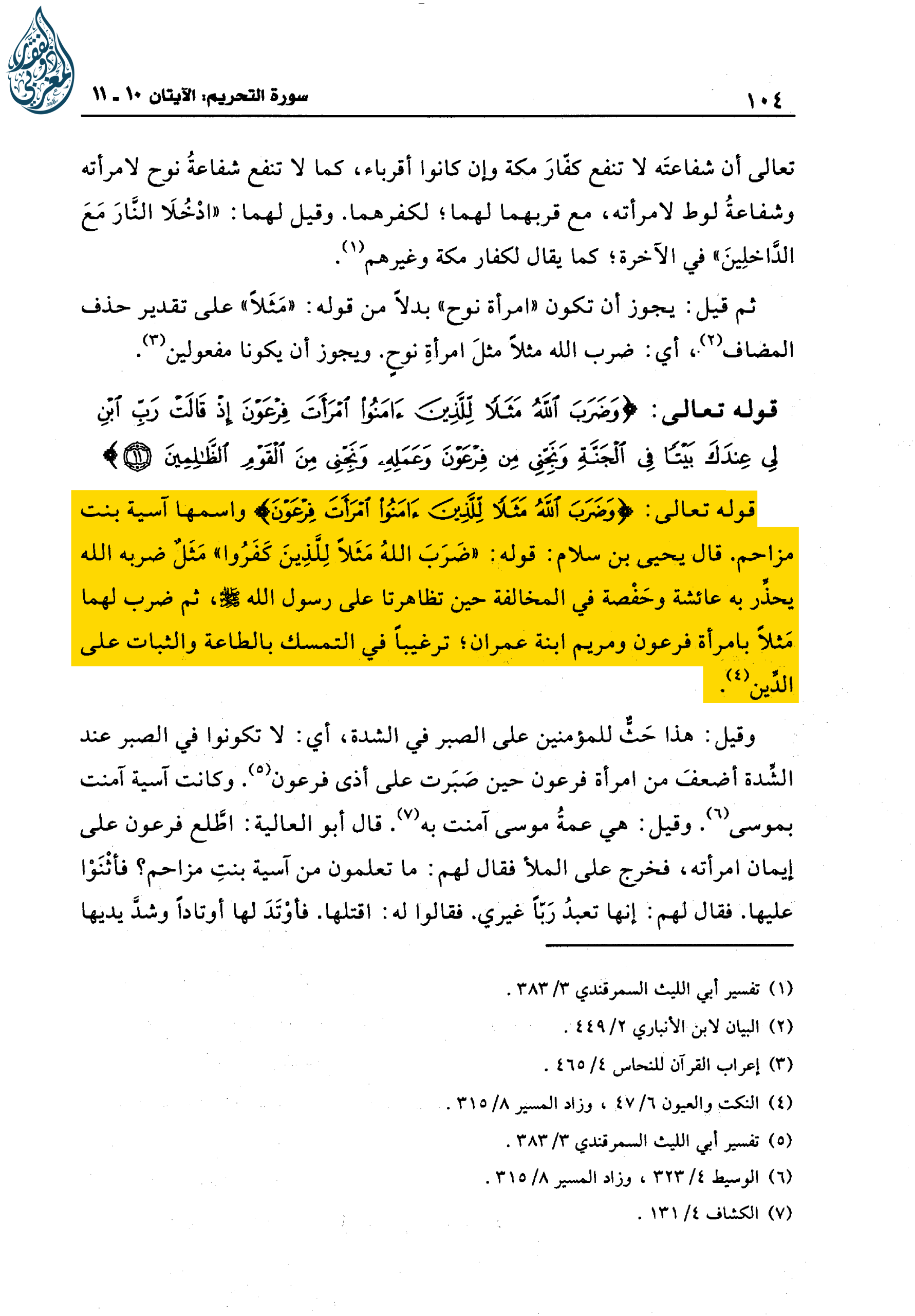 قَوْلُهُ تَعَالَى: (وَضَرَبَ اللَّهُ مَثَلًا لِلَّذِينَ آمَنُوا امْرَأَتَ فِرْعَوْنَ) وَاسْمُهَا آسِيَةُ بِنْتُ مُزَاحِمٍ. قَالَ يَحْيَى بْنُ سَلَّامٍ: قَوْلُهُ ضَرَبَ اللَّهُ مَثَلًا لِلَّذِينَ كَفَرُوا مَثَلٌ ضَرَبَهُ اللَّهُ يُحَذِّرَ بِهِ عَائِشَةَ وَحَفْصَةَ فِي الْمُخَالَفَةِ حِينَ تَظَاهَرَتَا عَلَى رَسُولِ اللَّهِ صلى الله عليه وسلم، ثُمَّ ضَرَبَ لهما مثلا بامرأة فرعون ومريم بنة عِمْرَانَ، ‌تَرْغِيبًا ‌فِي ‌التَّمَسُّكِ ‌بِالطَّاعَةِ وَالثَّبَاتِ عَلَى الدين