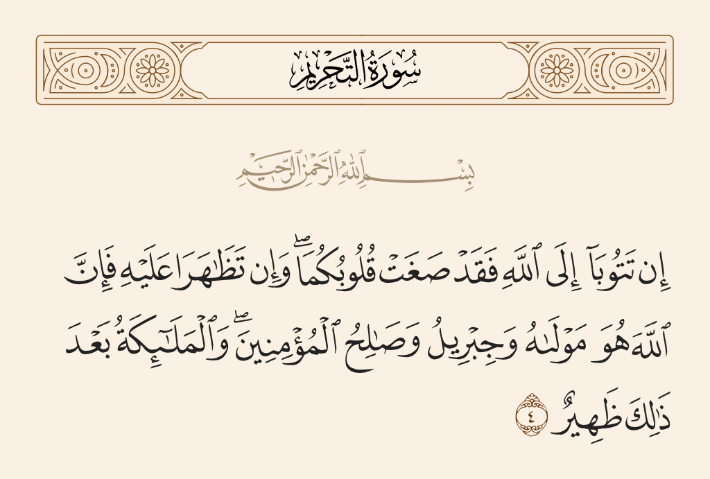 «{إِنْ تَتُوبَا إِلَى اللَّهِ فَقَدْ صَغَتْ قُلُوبُكُمَا وَإِنْ تَظَاهَرَا عَلَيْهِ فَإِنَّ اللَّهَ هُوَ مَوْلَاهُ وَجِبْرِيلُ وَصَالِحُ الْمُؤْمِنِينَ وَالْمَلَائِكَةُ بَعْدَ ذَلِكَ ظَهِيرٌ ‌‌(4) }