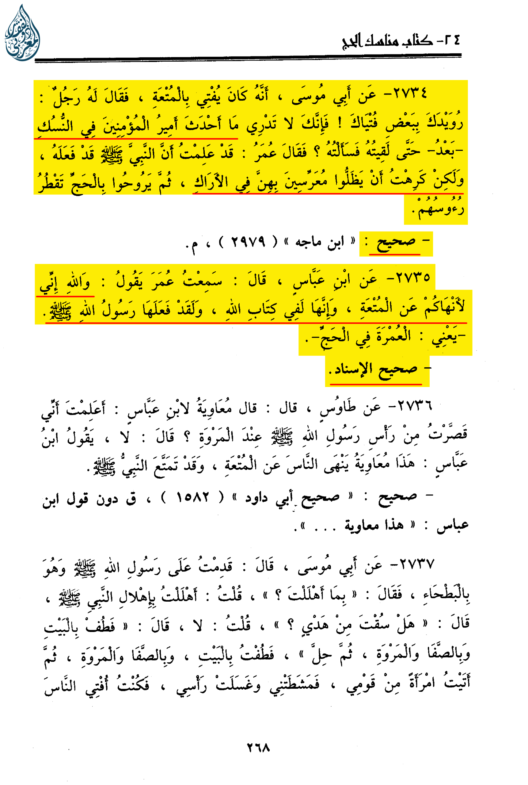 «عن أبي موسى: أنه كان يفتي بالمتعة، فقال له رجل: رويدك ببعض فتياك، فإنك لا تدري ما أحدث أمير المؤمنين في النسك بعد حتى لقيته، فسألته، فقال عمر: قد علمت أن النبي صلى الله عليه وسلم قد فعله، ولكن كرهت أن يظلوا معرسين بهن في الأراك، ثم يروحوا بالحج تقطر رؤوسهم.