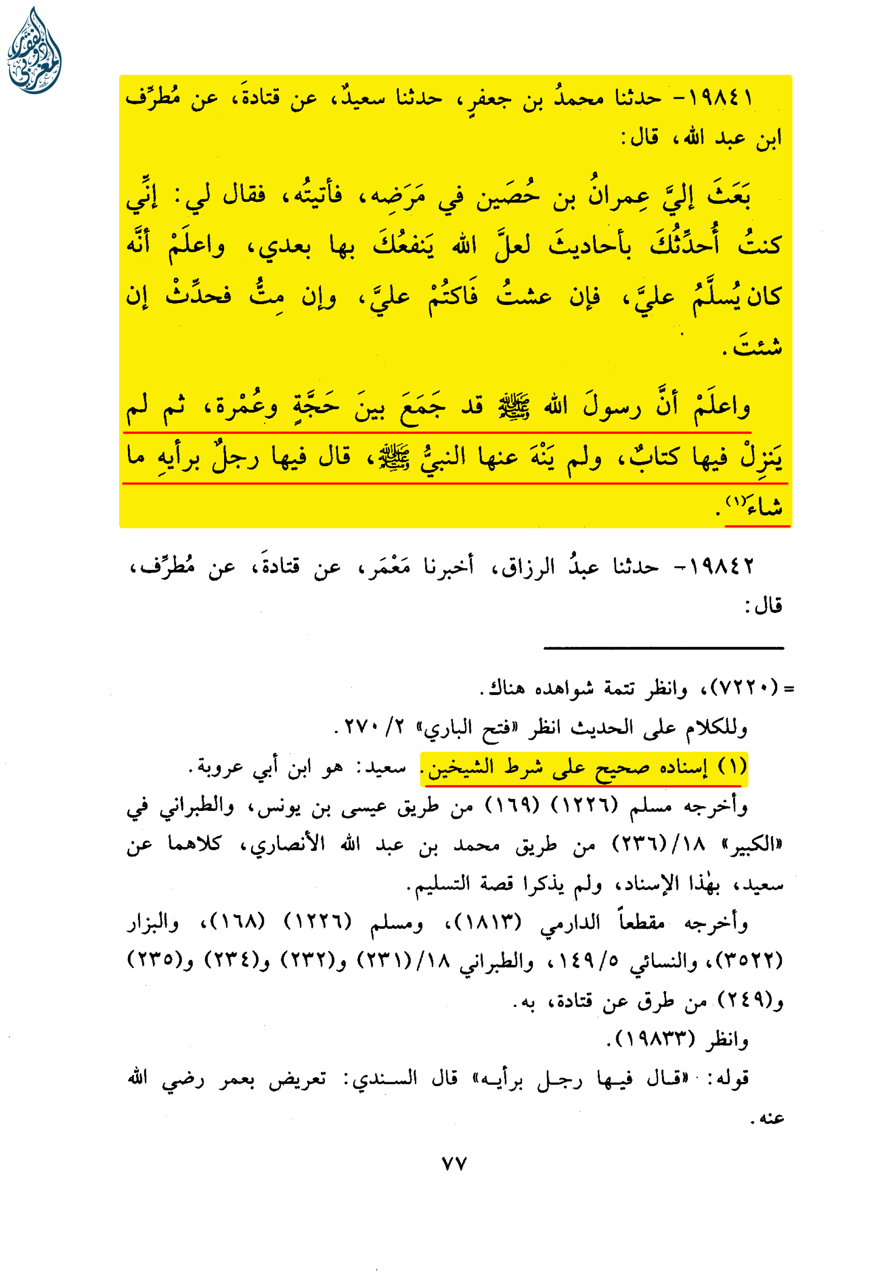 وَاعْلَمْ أَنَّ رَسُولَ اللهِ صلى الله عليه وسلم قَدْ جَمَعَ بَيْنَ حَجَّةٍ وَعُمْرَةٍ، ثُمَّ لَمْ يَنْزِلْ فِيهَا كِتَابٌ، وَلَمْ يَنْهَ عَنْهَا النَّبِيُّ صلى الله عليه وسلم، قَالَ فِيهَا رَجُلٌ بِرَأْيِهِ مَا شَاءَ (1).»