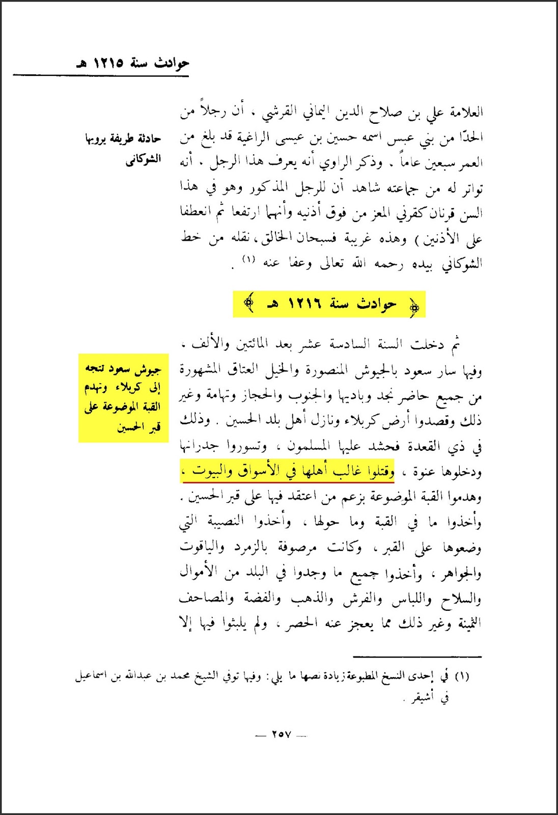 (ثم دخلت السنة السادسة عشر بعد المائتين والألف، وفيها سار سعود بالجيوش المنصورة والخيل العتاق المشهورة من جميع حاضر نجد وباديها والجنوب والحجاز وتهامة وغير ذلك، وقصدوا أرض كربلاء ونازل أهل بلد الحسين، وذلك في ذي القعدة، فحشد عليها المسلمون وتسوروا جدرانها ودخلوها عنوةً، وقتلوا غالب أهلها في الأسواق والبيوت، وهدموا القبّة الموضوعة بزعم من اعتقد فيها على قبر الحسين. وأخذوا ما في القبة وما حولها، وأخذوا النصيبة التي وضعوها على القبر، وكانت مرصوفة بالزمرد والياقوت والجواهر، وأخذوا جميع ما وجدوا في البلد من الأموال والسلاح واللباس والفرش والذهب والفضة والمصاحف الثمينة وغير ذلك مما يعجز عنه الحصر، ولم يلبثوا فيها إلا ضحوةً، وخرجوا منها قرب الظهر بجميع تلك الأموال. وقُتلَ من أهلها قريب ألفا رجلٍ).