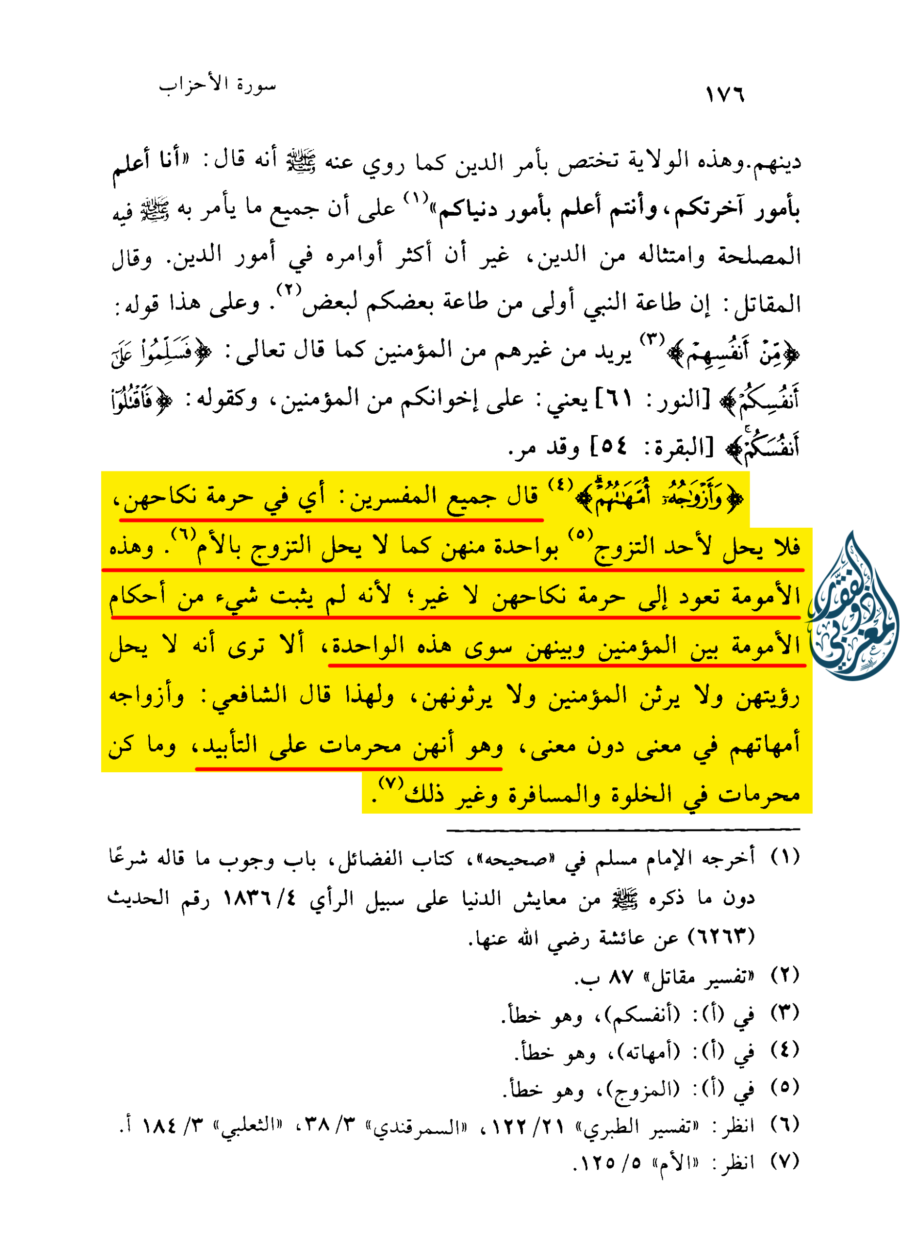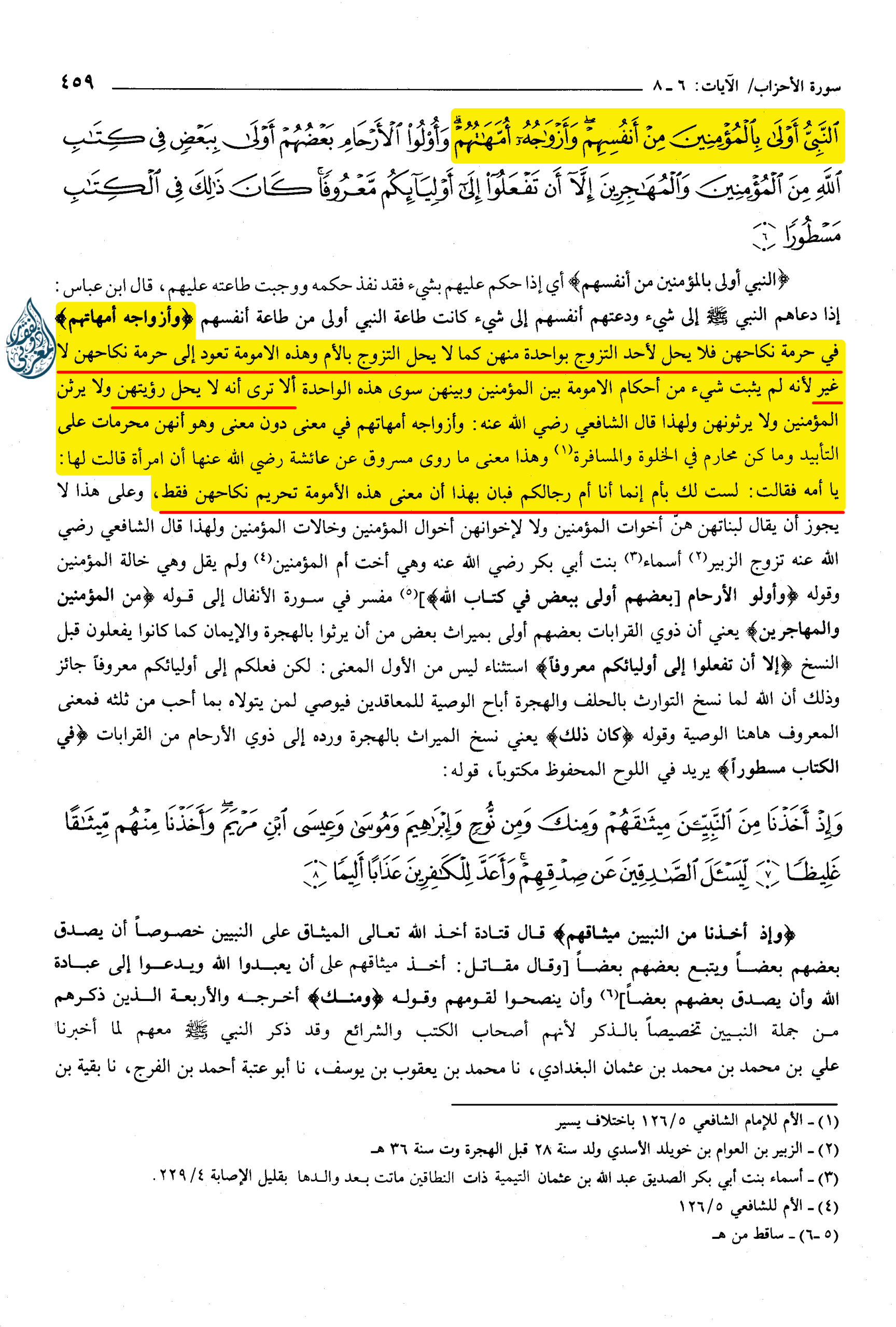 «{وَأَزْوَاجُهُ أُمَّهَاتُهُمْ} (4) قال جميع المفسرين: أي في حرمة نكاحهن، فلا يحل لأحد التزوج (5) بواحدة منهن كما لا يحل التزوج بالأم (6). وهذه الأمومة تعود إلى حرمة نكاحهن لا غير؛ لأنه لم يثبت شيء من أحكام الأمومة بين المؤمنين وبينهن سوى هذه الواحدة، ألا ترى أنه لا يحل رؤيتهن ولا يرثن المؤمنين ولا يرثونهن، ولهذا قال الشافعي: وأزواجه أمهاتهم في معنى دون معنى، وهو أنهن محرمات على التأبيد، وما كن محرمات في الخلوة والمسافرة وغير ذلك»