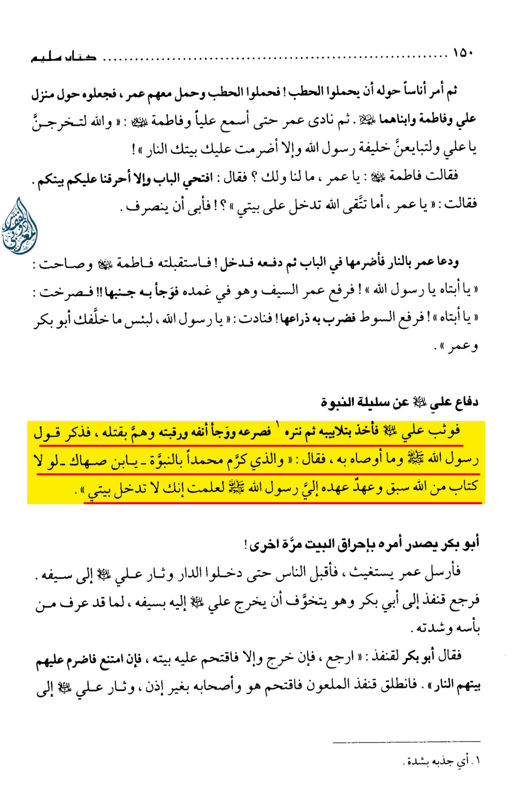 رابعاً: الإمام بعد أن حصل ذلك، هجم عليهم (لكنه لم يحرك سيفه فيهم لأن الرسول صلوات الله عليه وآله كان قد أوصاه بعدم رفعه) وقد ذكرت الروايات بأنه قد قبض على عمر وطرحه أرضا وجثى على صدره، لكنه لم يقتله لأنه موصى، فتكاثروا عليه وهو على تلك الحالة وقيدوه وأخذوها ملبباً!